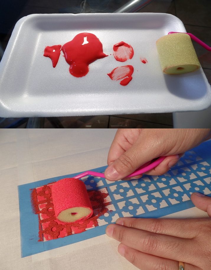 Utilize uma bandeja  para colocar a tinta, pode ser de isopor mesmo, o importante é espalhar bem a tinta para que não fique muito espessa no rolinho.