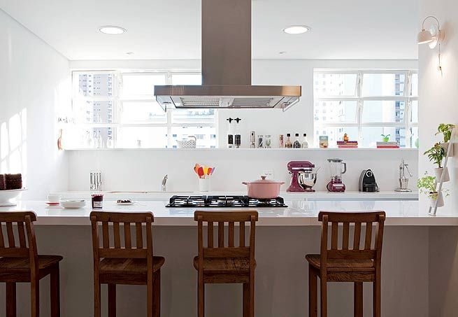 Em cozinha estilo americana as banquetas são uma ótima opção, porque normalmente são espaços integrados e reduzidos