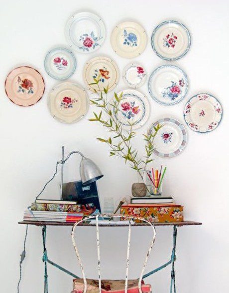 caso tenha pratos antigos com estampas florais e que já não estão em uso aproveita, você só precisa de um suporte para pendurar na parede.